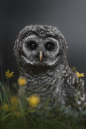 Barred Owlet in a field of blooming wildflowers.